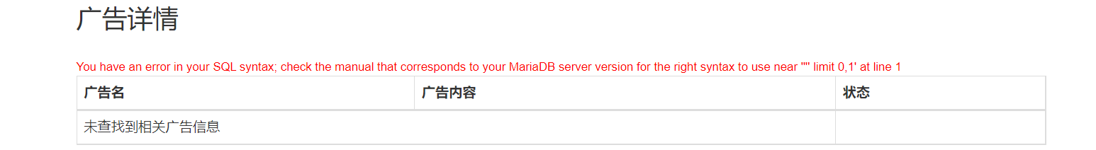 没有找到什么东西,但是我们发现这里是两个单引号,在测试一下,在广告名输入1'2得到