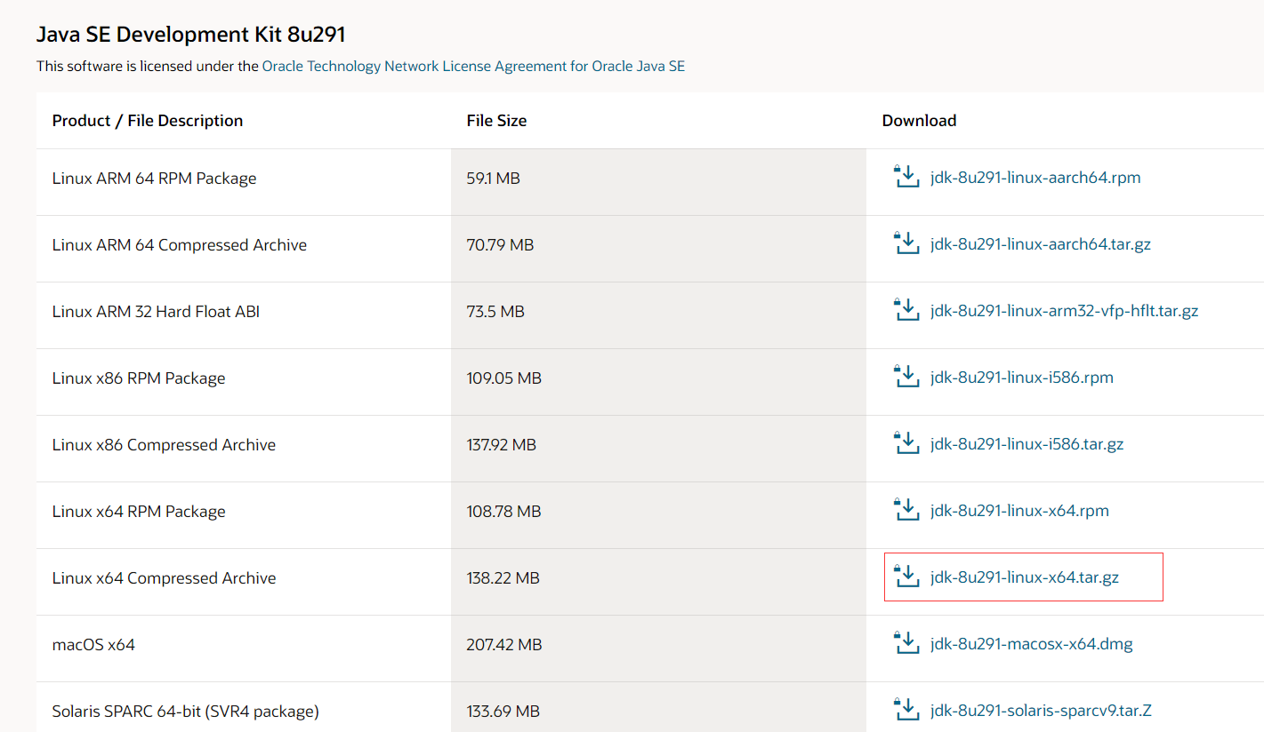 https://www.oracle.com/java/technologies/javase/javase-jdk8-downloads.html 我选择linux x64版本: